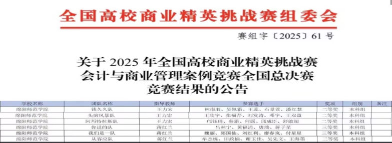在近日落幕的2025年全国高校商业精英挑战赛会计与商业管理案例竞赛全国总决赛中,公司太阳集团tyc151学子表现优异,共获得全国二等奖3项、三等奖3项,成绩斐然。