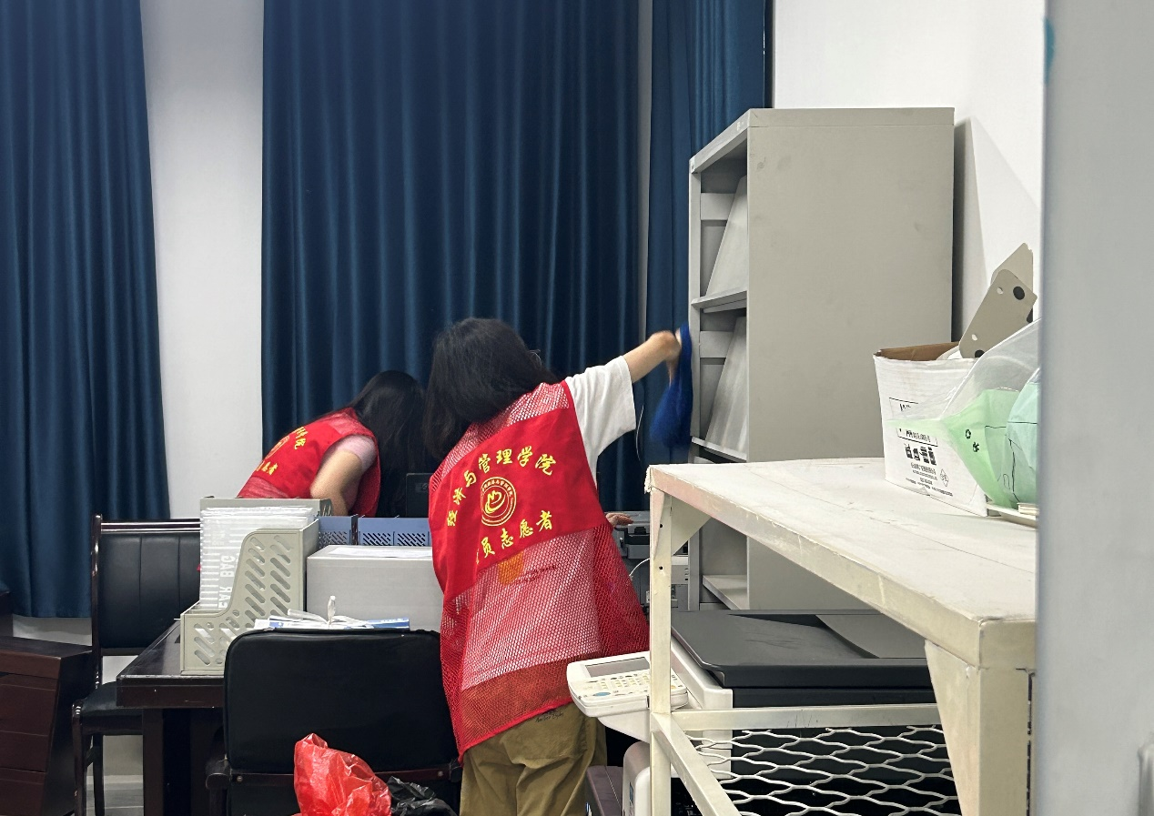 在支部书记的带领下,毕业生党员们分工明确,互相协作,以实际行动表达对母校的热爱,对公司实验室、考研教室等进行卫生大扫除,为校园生活留下美好回忆。他们认真的打扫每一间教室,清理课桌、椅子、地面,擦拭黑板和窗户,让每一个角落都焕发出新的光彩,同时展现出积极向上、精神饱满的良好状态,成为教学楼里一道亮丽的风景线。