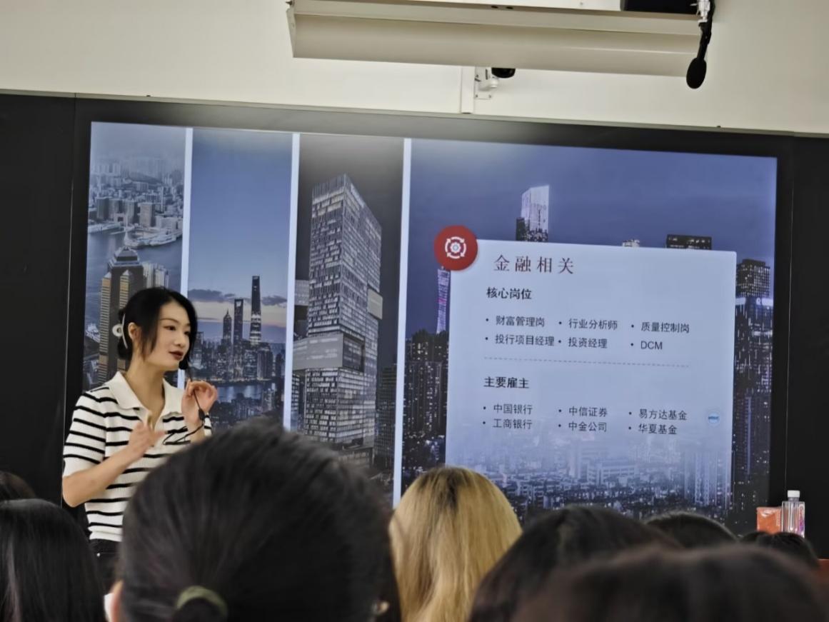 随后,高顿教育集团的沈艾老师接过 “新生成长指导” 的接力棒,以 “大学规划与未来选择”为主题,为在场新生带来了一场兼具实用性与前瞻性的指南分享。针对新生普遍关心的未来发展方向,沈艾老师围绕 “考研、留学、就业”三大核心路径展开细致解读。此外,沈艾老师还特别聚焦“求职关键期”,详细介绍了秋招、春招的时间节点差异、企业招聘流程以及简历投递的注意事项。她用清晰的逻辑与具体的案例,将复杂的规划问题拆解为可操作的步骤,让新生们对大学四年的学习目标与未来发展路径有了更清晰、更明确的认知,为后续的成长规划打下了坚实基础。