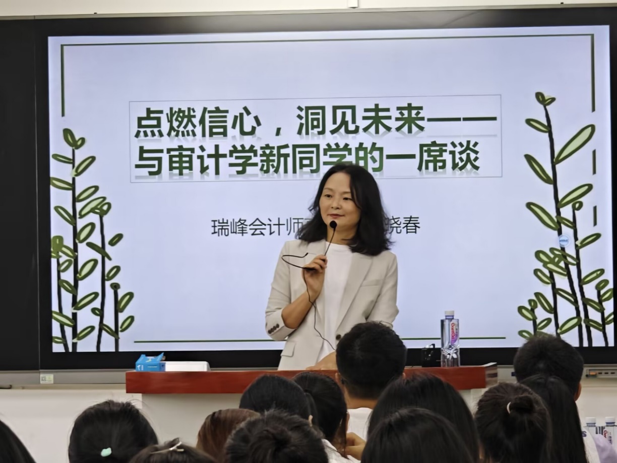 讲座伊始,瑞峰会计师事务所总经理周晓春以“新生对审计行业的认知误区与职业困惑”为切入点,为新生们解读审计行业的发展前景。她结合往届毕业生的工作现状、实习经历以及自身职业历程,全方位介绍了审计学专业的发展趋势与未来就业方向。周晓春鼓励新生,不仅要扎实掌握课本知识,更要积极投身实践实习,同时要始终坚守审计人的职业道德,以适应社会发展的需求。