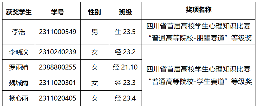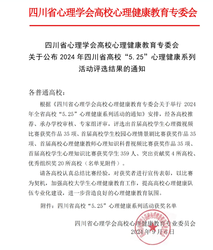9月6日,四川省心理学会高校心理健康教育专委会公布2024年四川省高校“5.25”心理健康系列活动评选结果。经过激烈的角逐,我院李晓汶、罗雨婧、魏城雨、杨心雨四名同学荣获“四川省首届高校员工心理知识比赛-员工赛道”等级奖。