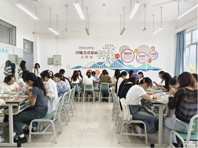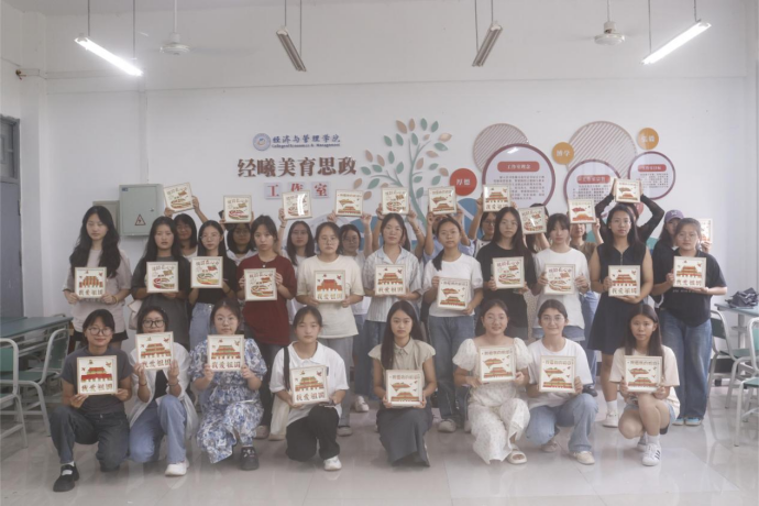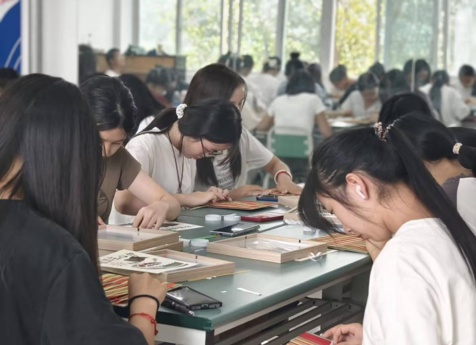活动开始时,吴小英老师结合视频资料,用通俗易懂的言语介绍竹编画背后的革命历史、制作流程及传承意义,为同学们揭开竹编工艺的神秘面纱。竹编,作为我国非物质文化遗产之一,以悠久的历史、丰富的文化内涵、造型多变的编织手法,成为“跳跃在指尖的艺术”,是中华优秀传统文化的重要组成部分。随后,同学们根据操作步骤,小心翼翼地将不同颜色的竹片放在合适的位置上。“一压一抬一挑”间,一根根竹条落有致、紧密相连,很快,一幅幅精美的爱国主义竹编画就完成了。经管学子们用一根根编织条,编织出一片热诚与赞美,用实际行动去表达经管学子对国家、对民族的深爱之情。