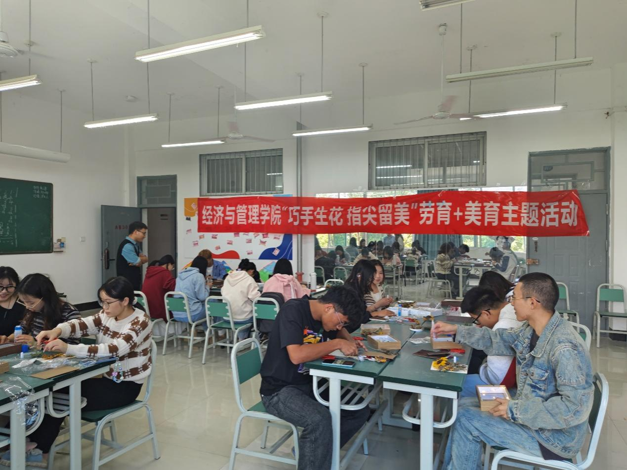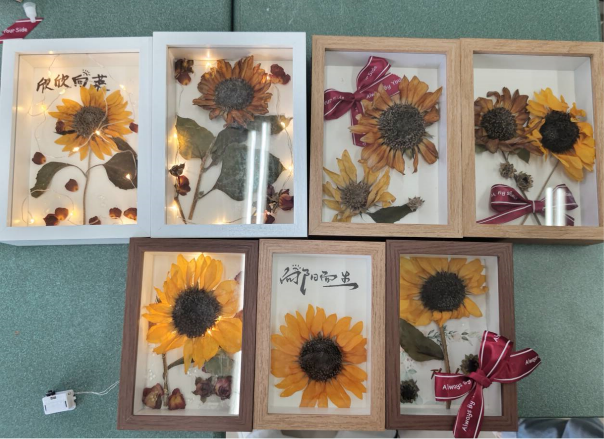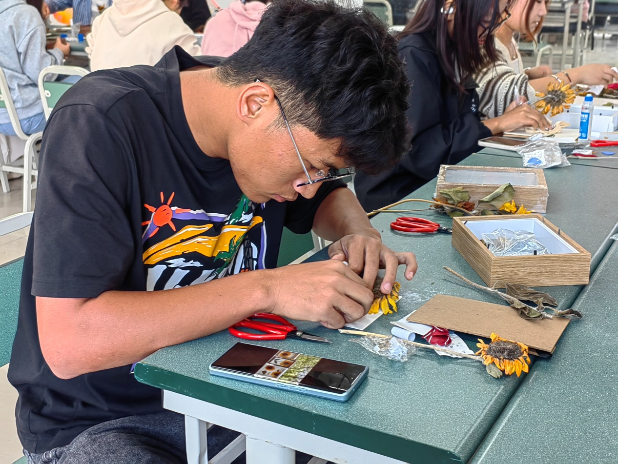 活动现场同学们拿起干花,仔细挑选自己喜欢的颜色与形状,在相框中构建出一幅幅生动的画。在制作过程中,同学们不仅展现出了极高的动手能力和创造力,更在相互帮助与交流中增进了友谊。经过90分钟的制作,一幅幅精美的干花相框制作完成。这些作品不仅凝聚了同学们的心血与汗水,更寄托了他们对美好生活的向往与追求。