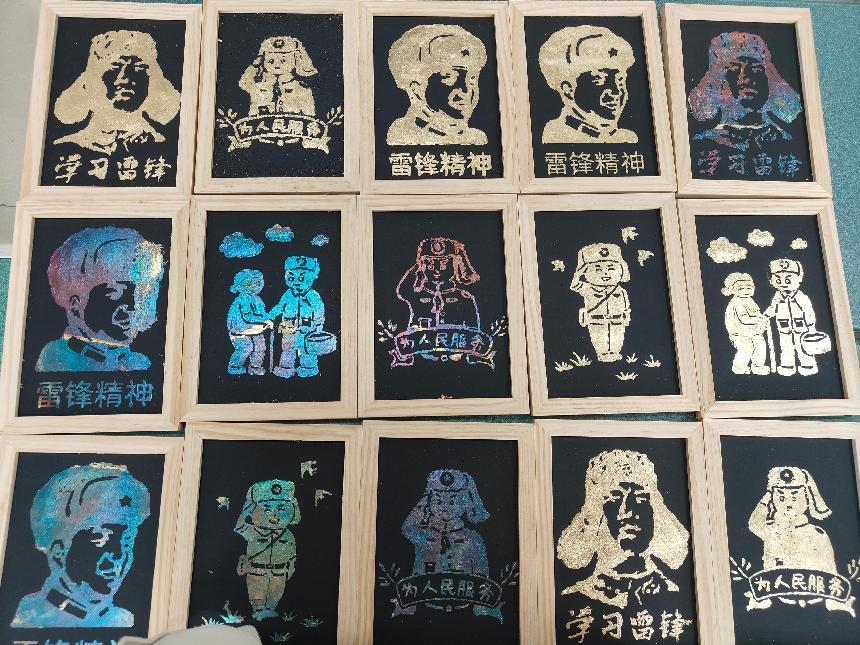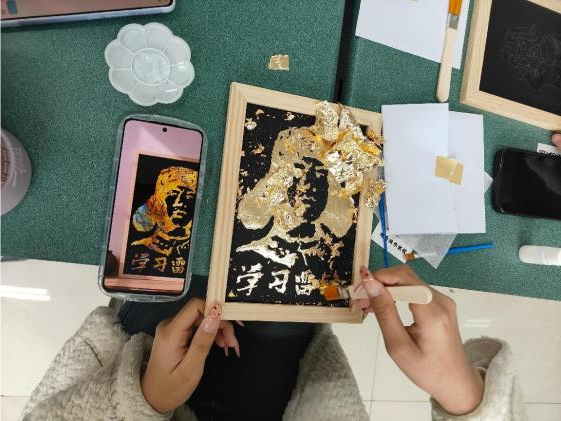 活动现场,专业指导人员通过多媒体教学与现场示范,系统讲解金箔画贴箔技法与纽扣画构图原理。参与者以雷锋事迹为创作蓝本,运用镊子、胶水等工具,将零散的金箔碎片与彩色的纽扣巧妙组合,完成创作。制作过程中,同学们既严格遵循传统工艺要求,又融入现代艺术思维,有的以渐变金箔展现"螺丝钉精神"的永恒光辉,有的用纽扣拼贴出新时代雷锋群像。整个创作过程中,同学们不仅展现出了非凡的艺术才华,更在无形中深化了对雷锋精神的理解和感悟。