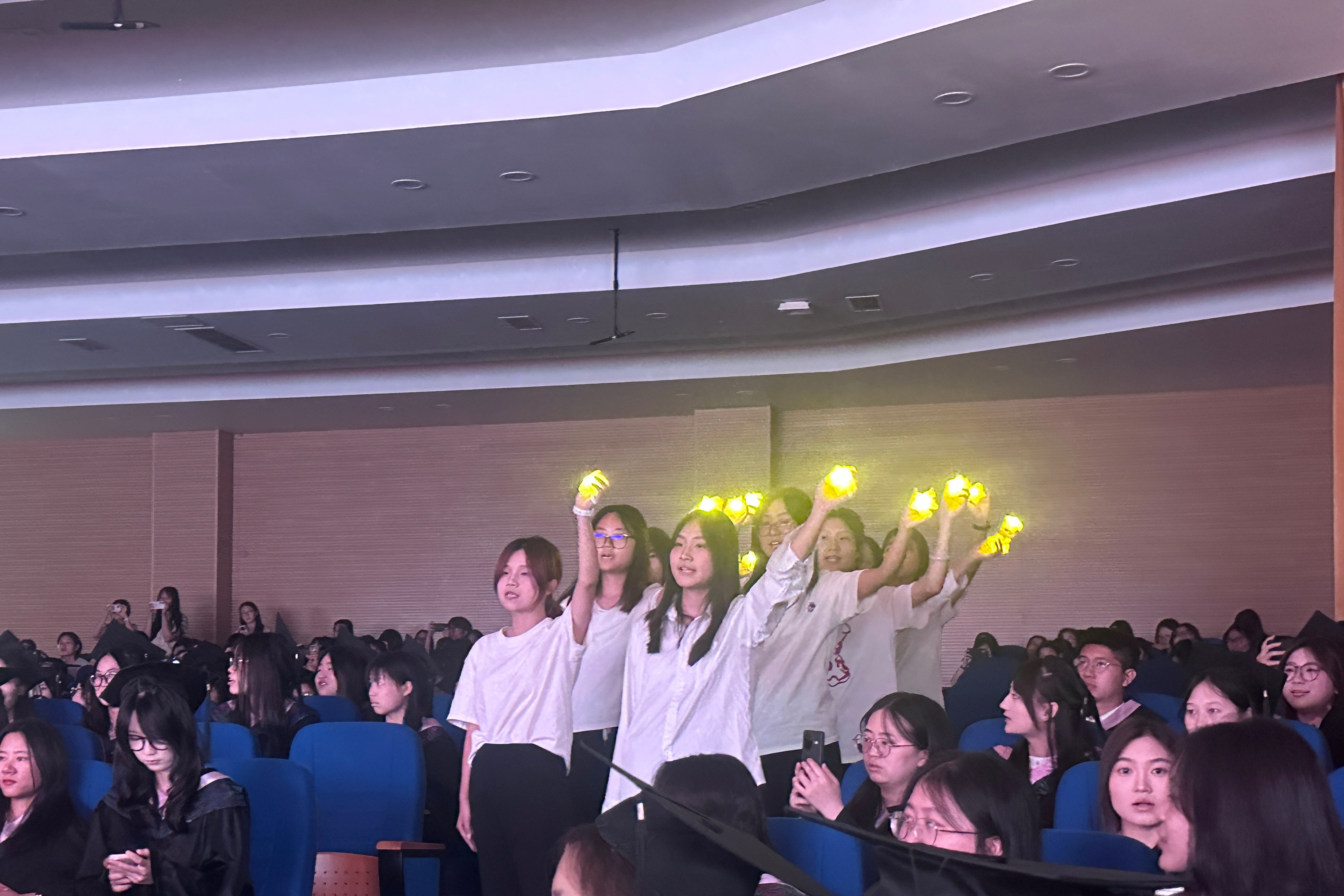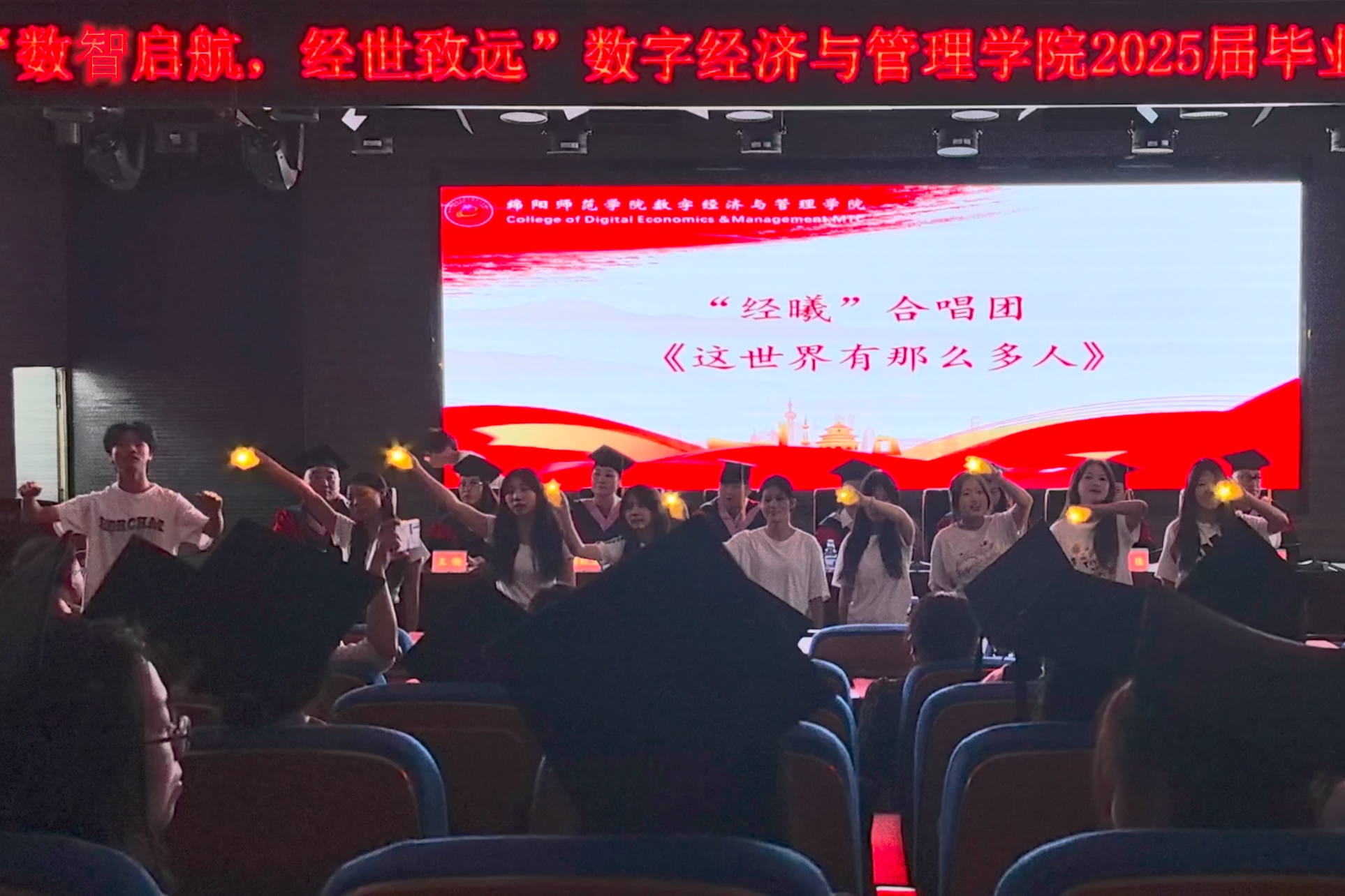 “经曦”合唱团的歌声如清泉漫过心岸,《这世界有那么多人》的旋律里,多少目光在交错中泛起泪光。当“身旁那么多人,可世界不声不响”的歌词唱响时,全场仿佛被按下静音键,只有歌声在空气中震颤。灯光渐灭,《送别》的旋律如月光般从会场深处流淌开来,“长亭外,古道边”的歌声里,有人悄悄拭去眼角的湿润,有人与身旁同窗紧握双手。灯光重新亮起,映照着毕业生们眼中闪烁的星光。主席台两侧骤然绽放的礼花,与《送别》的旋律交织成一曲壮美的离歌,目送着这群以“数智” 为剑、“经世”为盾的青年,走向更辽阔的天地。