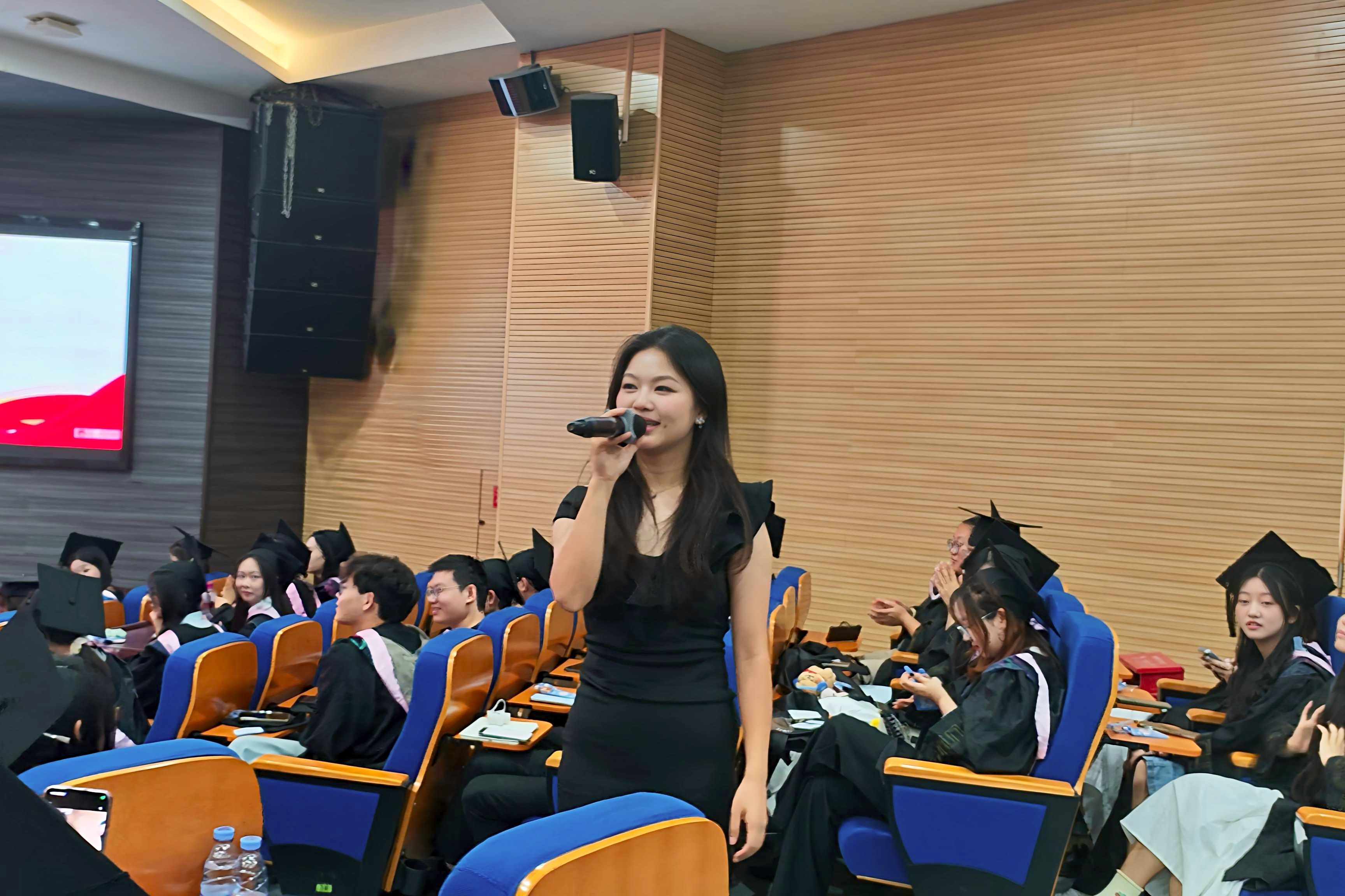 副经理蒋红兰的致辞宛如晨曦中的晨钟,在温情中蕴藏着智者的远见:“愿你们以数智为帆、经世为桨,在未知海域劈开属于自己的航道。”话音刚落,快闪表演《一路生花》骤然响起,王爱平老师与三位同学的歌声如清泉流淌,“我希望许过的愿望一路生花”的旋律中,投射着老师的叮咛、同窗的情谊,将现场气氛推向炽热顶点。