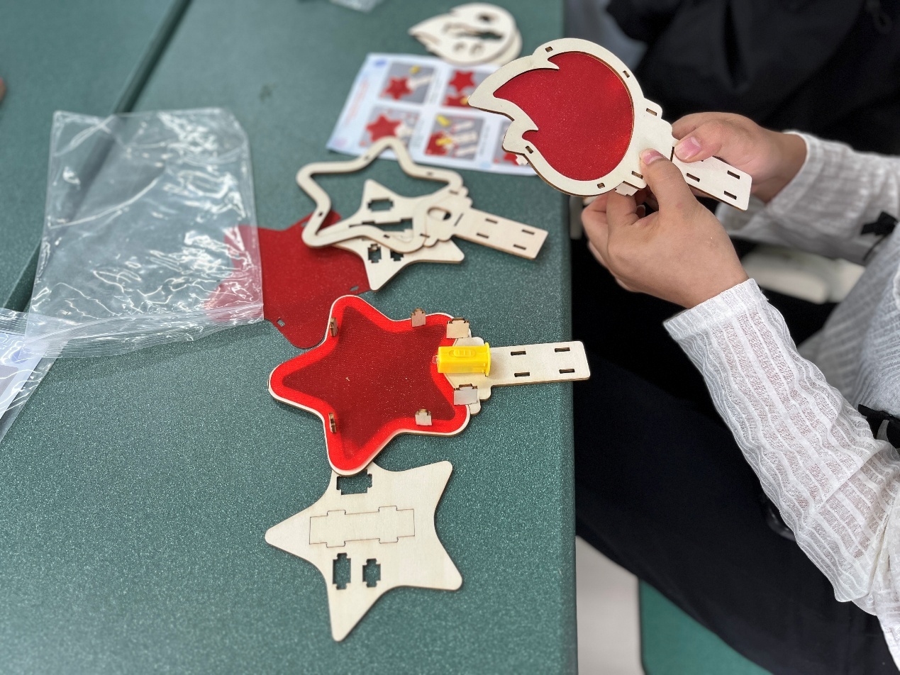 活动伊始,公司党委副书记、纪委书记李杨首先结合历史与时代背景向现场同学讲解了国庆节不仅是国家成立的纪念节点,更是凝聚民族精神、传递家国情怀的重要载体。接着,美育实践指导教师王爱平细致地向同学们讲解了制作木质火炬与弦丝画的步骤与方法。教室里木片、彩丝有序铺展,木质DIY火炬渐渐显露出流畅的线条,弦丝画中的红金纹路慢慢勾勒出对祖国真挚的祝福。其中制作弦丝画对同学们来说有一定挑战,需要极强的专注力和耐心。做完DIY木灯的同学便来帮忙协助做弦丝画,大家从一开始的急躁转入沉浸,最后完成的作品给大家带来心灵的藉蔚。